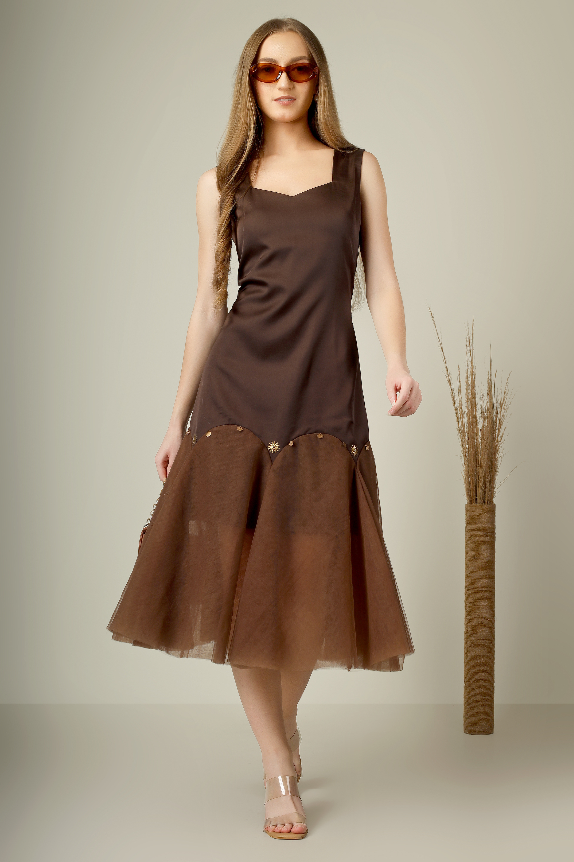 Crafted from a luxurious combination of net and satin, this 1-piece dress offers a body-hugging fit that accentuates your silhouette beautifully. The sweetheart neckline adds a feminine touch, while sleeveless styling gives a modern, chic look.