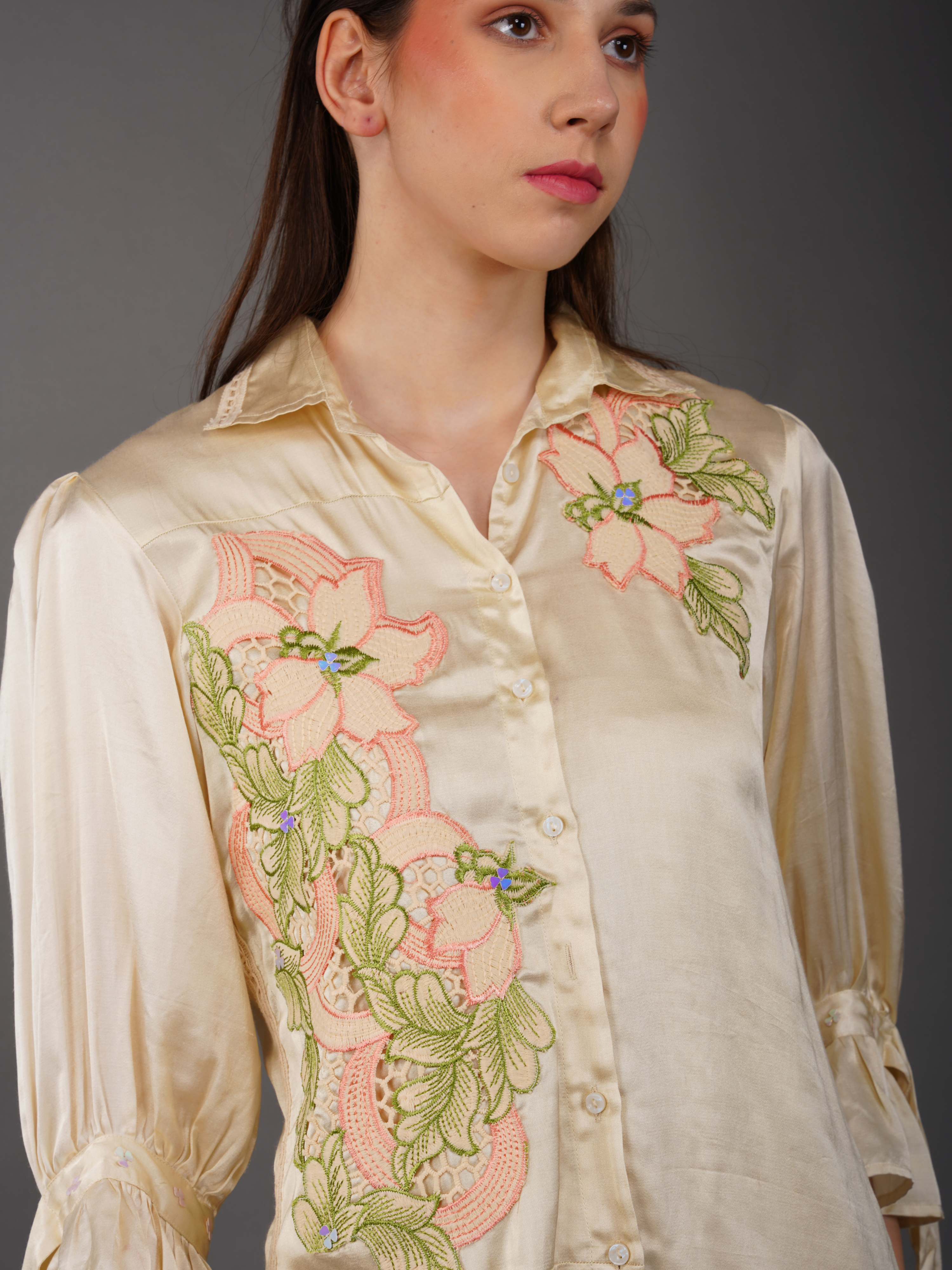 The Crotia Co-Ord Set features a beautiful combination of satin sheen and luxurious floral embroidery. Crafted from modal satin, this set showcases delicate, hand-sewn embellishments on both the top and pants, offering a chic and sophisticated look. With a comfortable fit, it’s the ideal ensemble for a polished yet relaxed look that transitions effortlessly from day to evening.
