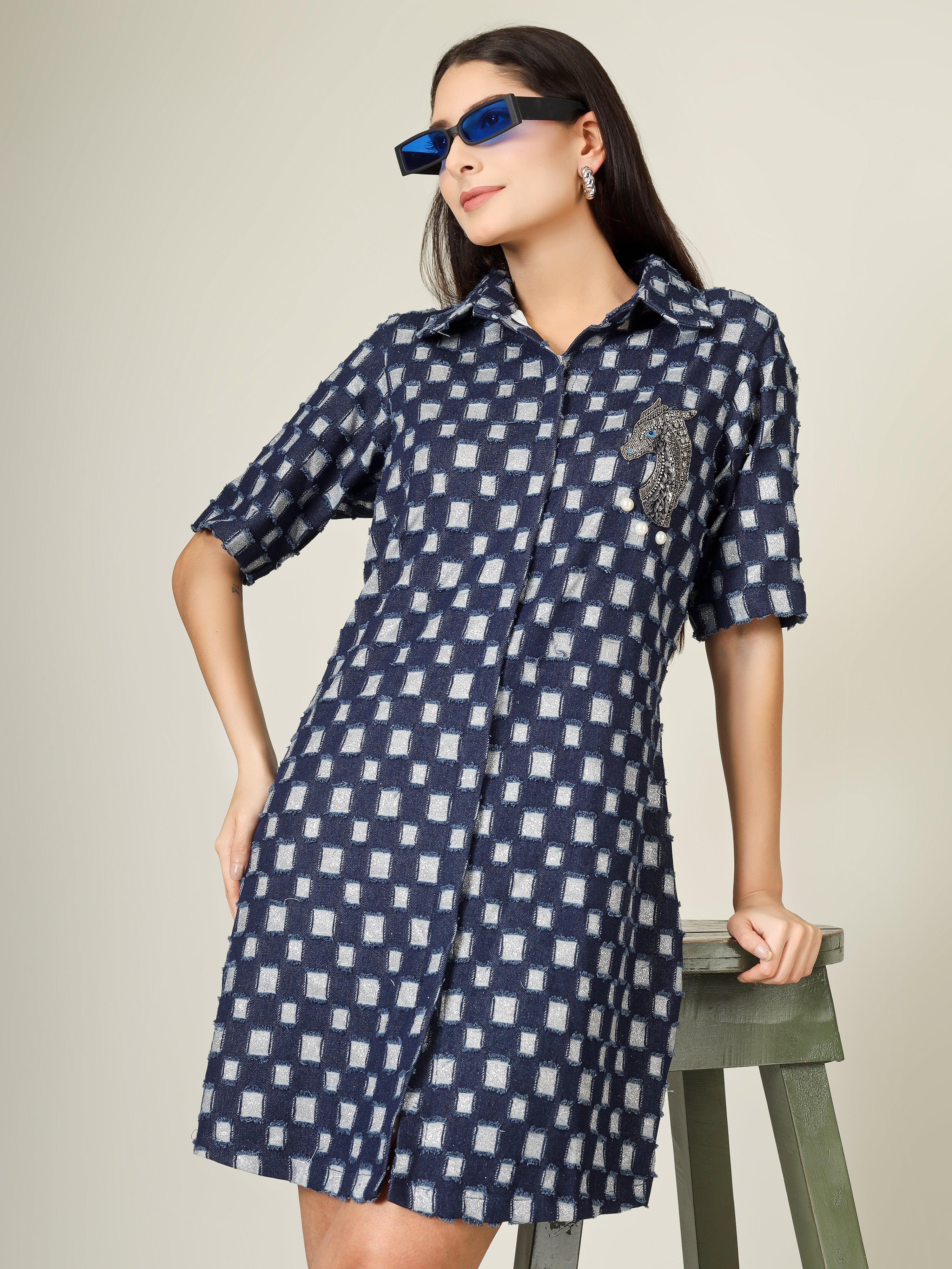 Denim Horse Head Dress – A chic blend of comfort and bold artistry. Featuring a hand-embellished horse motif with pearls and beadwork, this A-line denim dress flatters all body types with its relaxed fit and modern mid-thigh length. Perfect for both casual and evening looks.