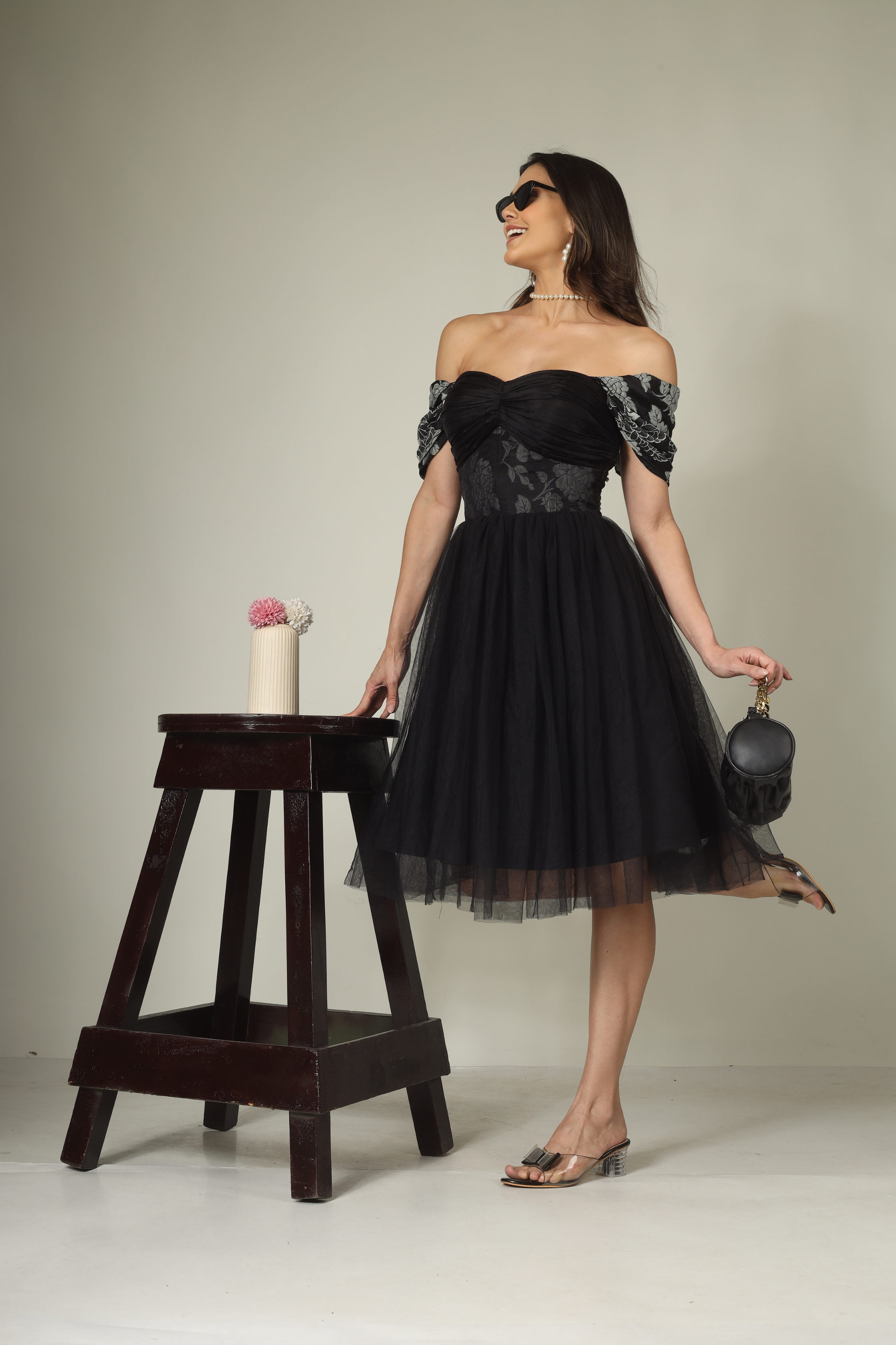 Embrace elegance and modern glamour with the Black Off-Shoulder Dress from the Midnight Hues Collection – Astra by Ayushi.