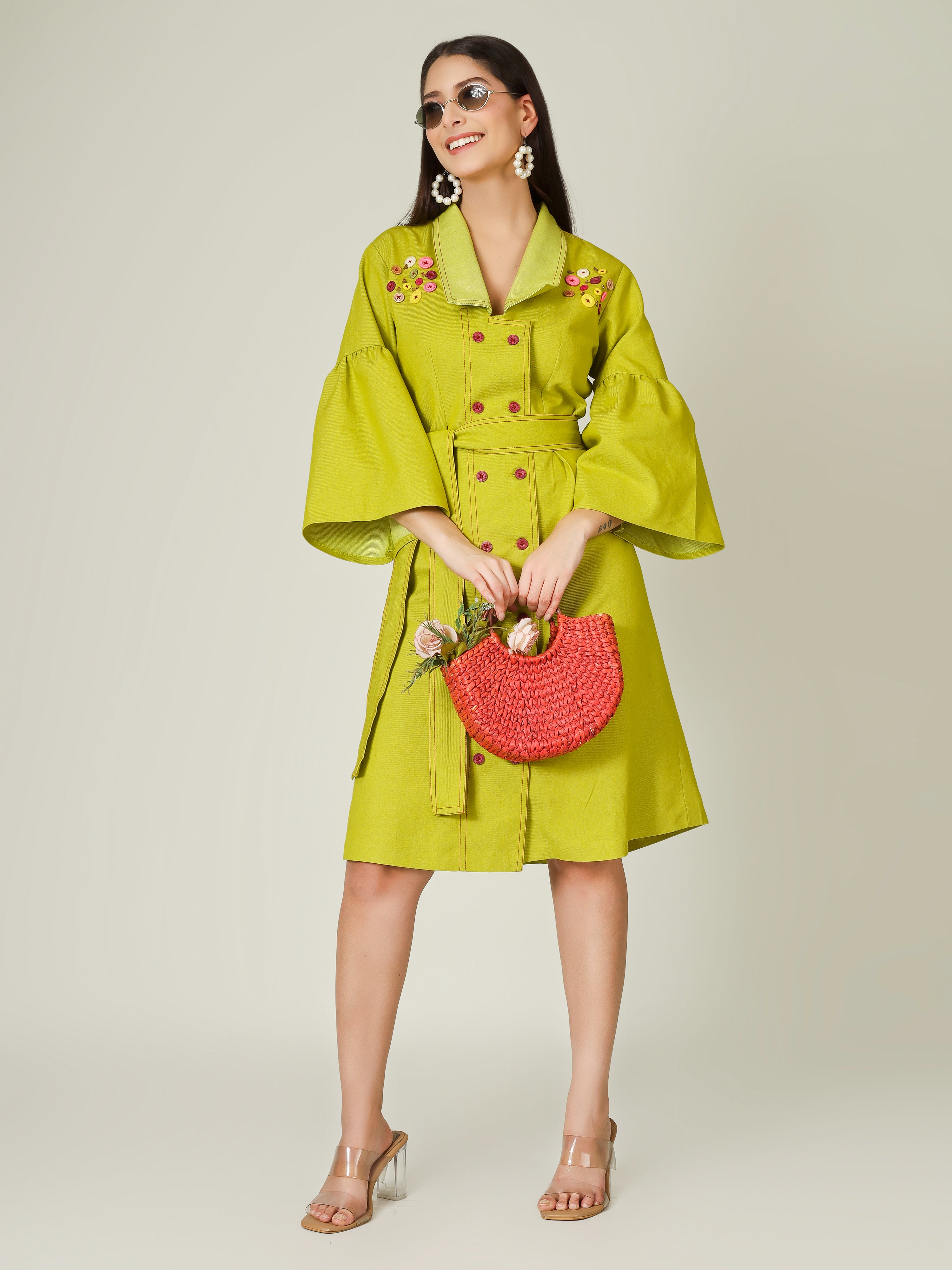 Featuring a flattering double-breasted front, dramatic flared sleeves, and a detachable waist belt, this dress blends structure with femininity. The highlight is the hand-embroidered floral embellishments on the shoulders, lending it a playful yet chic vibe.
