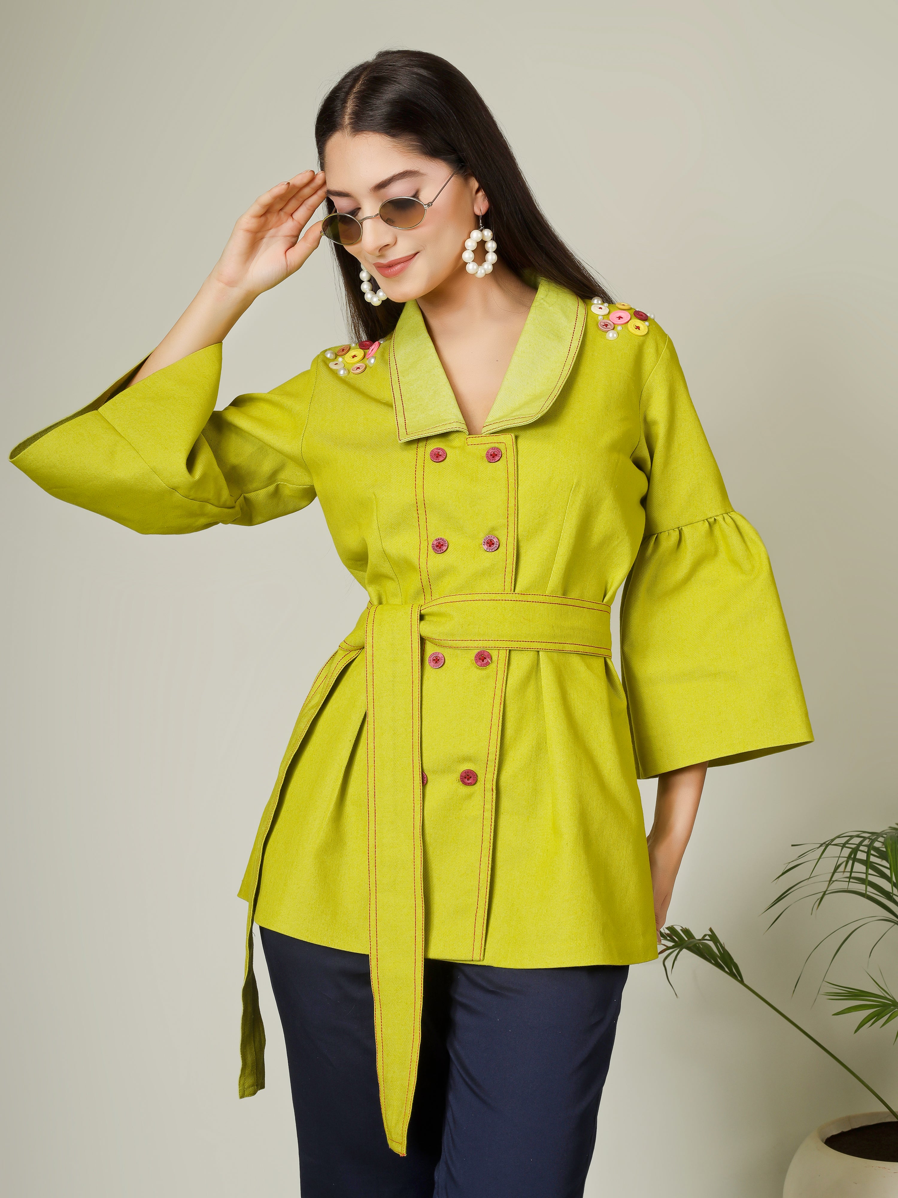 Featuring a double-breasted front with contrast buttons, flared sleeves, and a waist-cinching fabric belt, this jacket flatters your silhouette effortlessly. The highlight is the delicately embroidered floral embellishments on the shoulders, adding a feminine charm to its structured look.