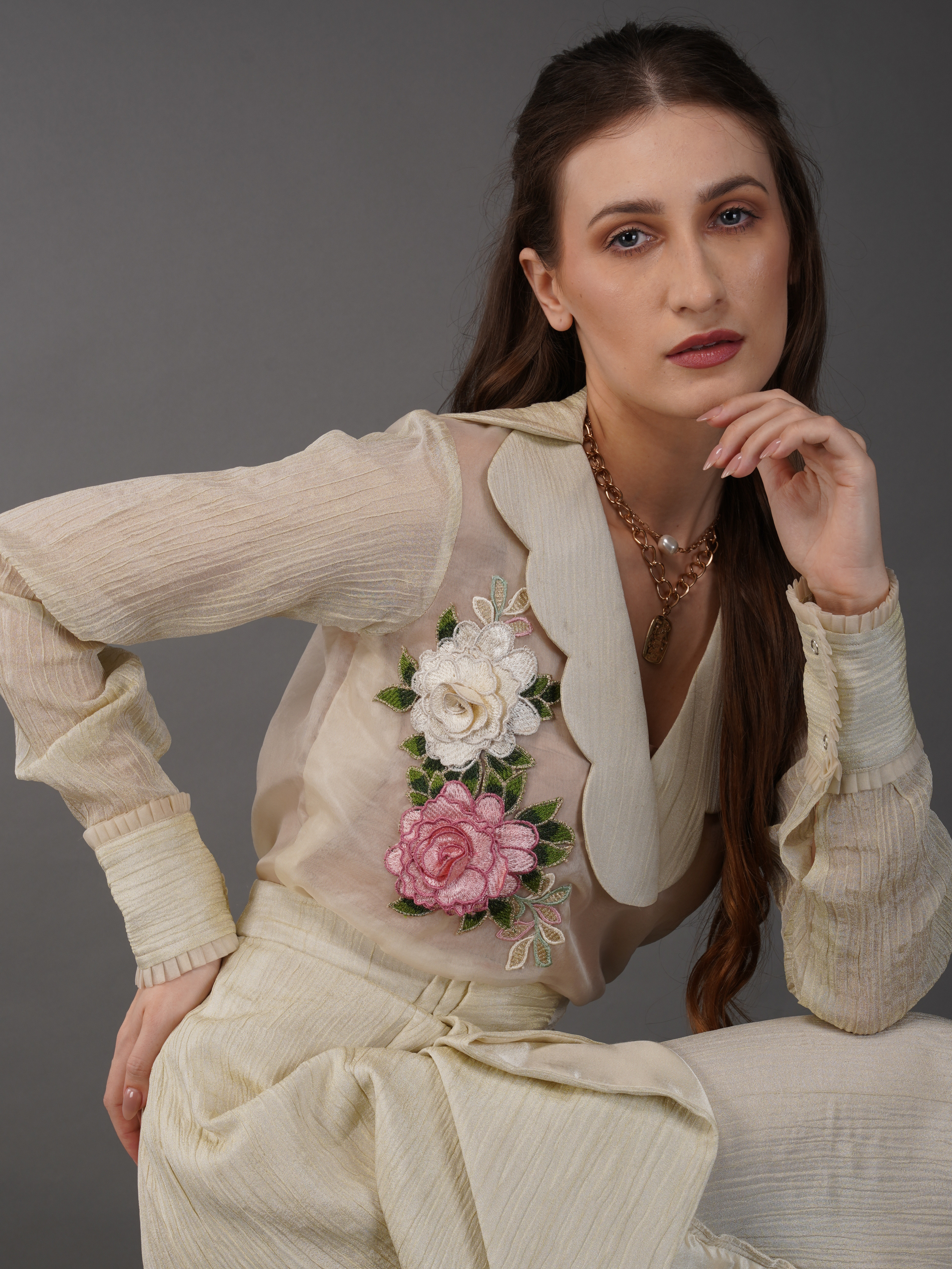 Crafted from luxurious organza and crush tissue, the Waterfall Skirt Set combines graceful movement with hand-sewn embellishments. Its elegant design makes it the perfect choice for both casual outings and special occasions, offering timeless sophistication.